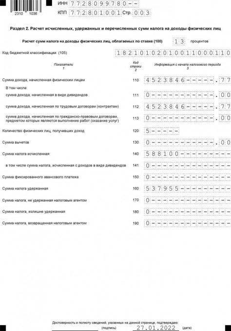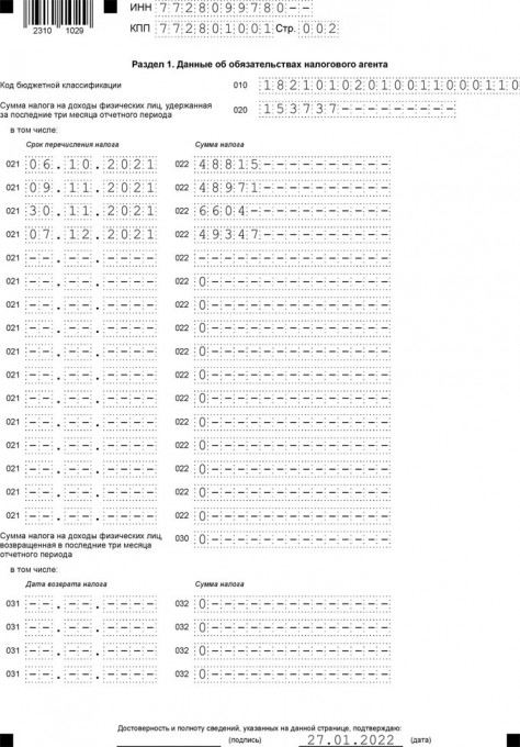 - 022 (сумма налога) — здесь указывается общая сумма удержанного НДФЛ, срок уплаты которого соответствует дате, указанной в строке 021 слева.